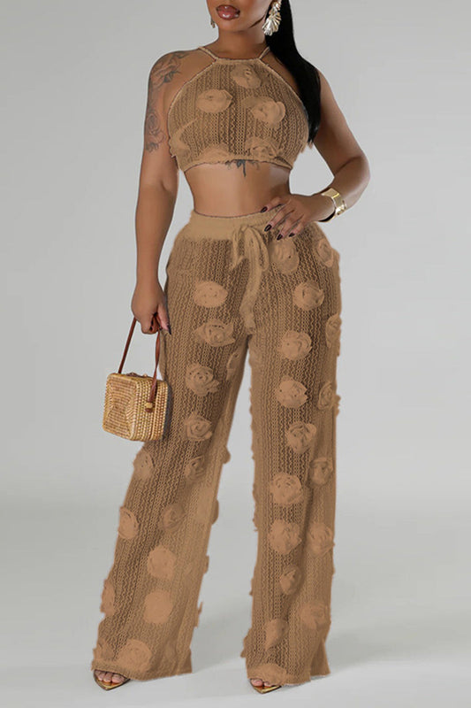 Casual Flowers Patchwork See-Through Backless Cross Straps Strap Design Halter Sleeveless Two Pieces