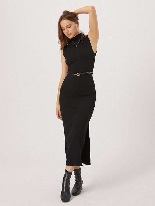 Turtleneck Long Sleeve Mini Dress with Slit and Ribbed Paneling