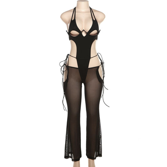 Halter self tie hollow out low cut backless mesh bodysuit pant set-final-sale