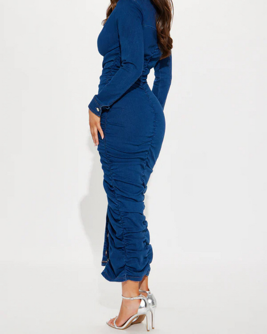 Stretch Denim Chest Wrap Sexy Pleated V-Neck Denim Dress