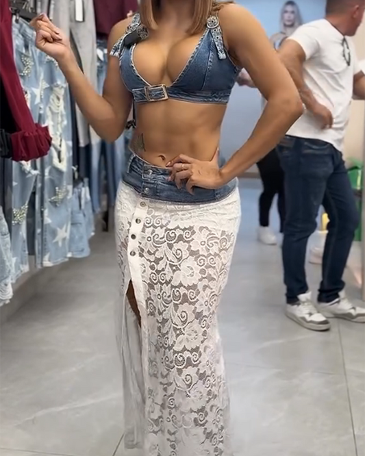 Halter Neck Button Washed Stretch Denim Mini Skirt Set