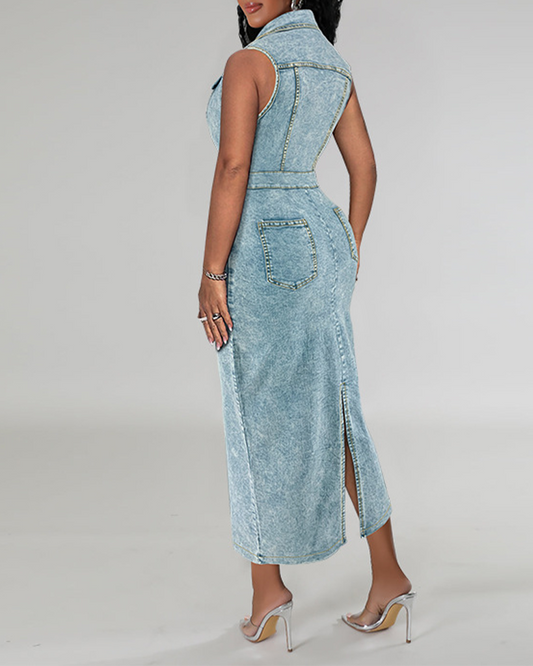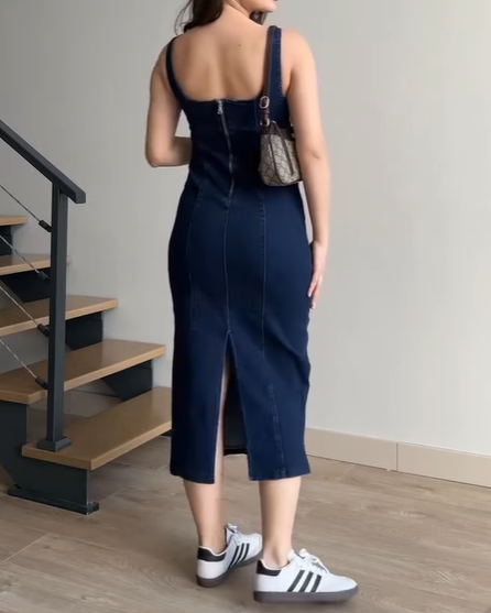 Diagonal Cut Slit Back Zipper Denim Slim Dress