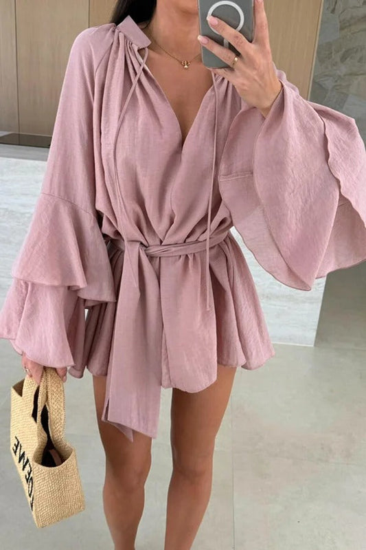 Molly Linen Blend Tiered Bell Sleeve Tie-up Cover-up Mini Dress