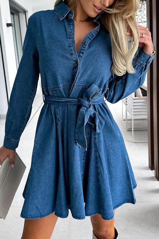 Stylish Long Sleeve Pocket Waist Belted Denim Mini Dress