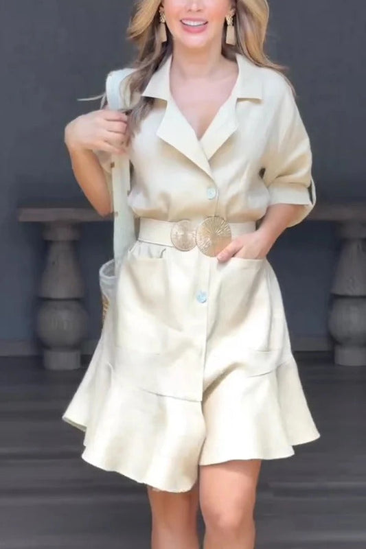 Solid Color Casual Lapel Pocket Ruffle Loose Mini Dress