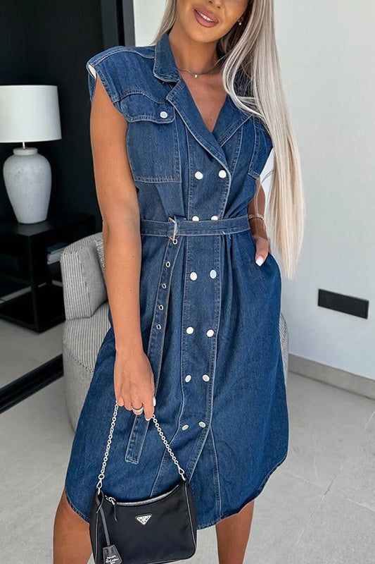 Solid Color Casual Lapel Sleeveless Button Pocket Waist Tie Denim Midi Dress