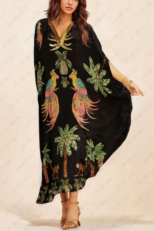 Unique Drop Shoulder Sleeve Coconut Tree Printed Dress
