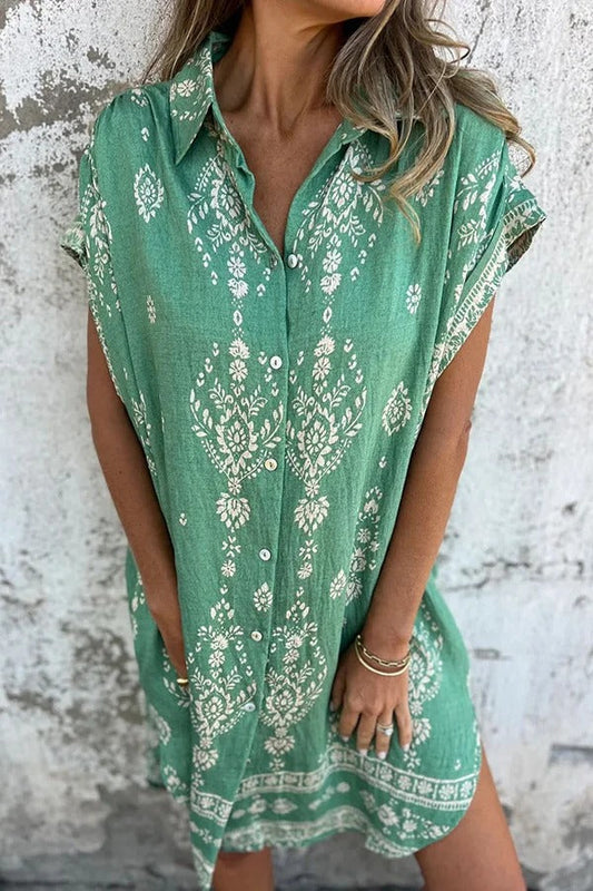 Linen Blend Unique Print Lapel Casual Pocket Mini Dress