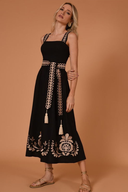 Embroidered Sleeveless Slip Midi Dress With Belt