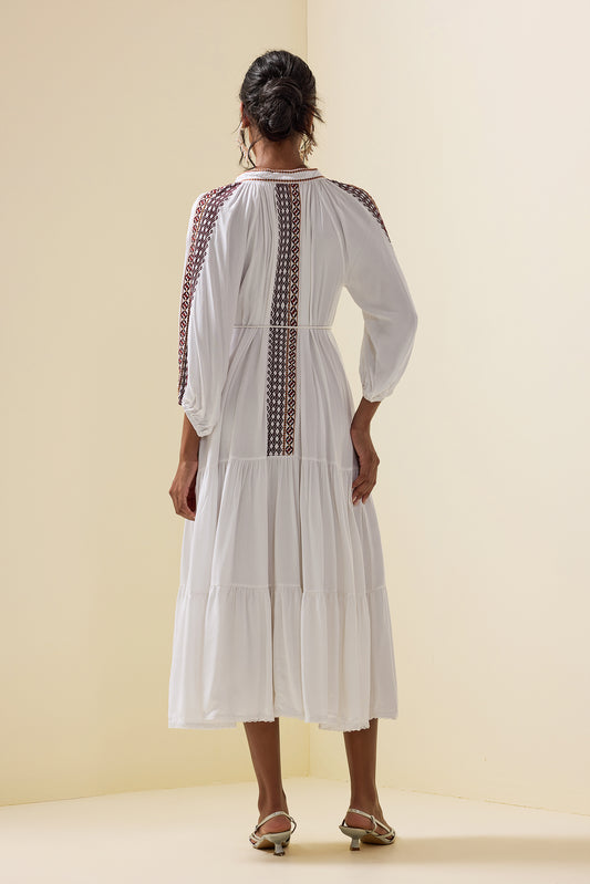 Paisley Print Embroidered Midi Dress With Belt