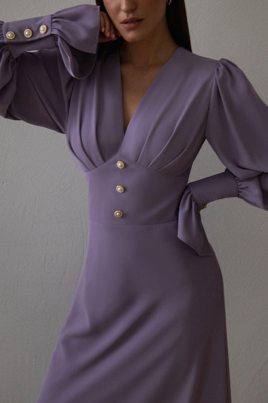 Floral Lantern Sleeve Lapel Buckle Maxi Dress