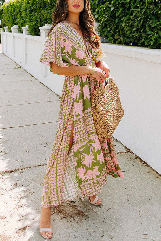 Geometric Print Casual V Neck Maxi Dress