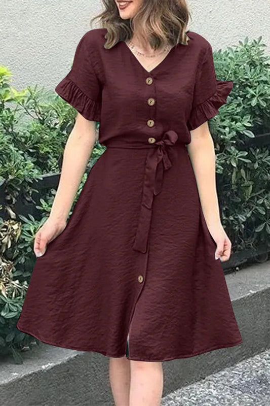 Casual Simplicity Solid Frenulum Buckle Flounce V Neck A Line Dresses