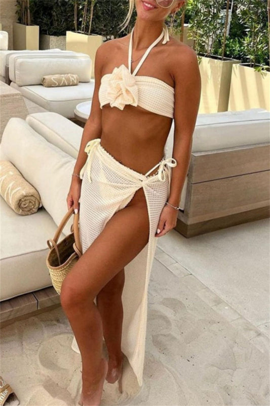 Sexy Solid Bandage Backless Slit Halter Sleeveless Three Piece Set
