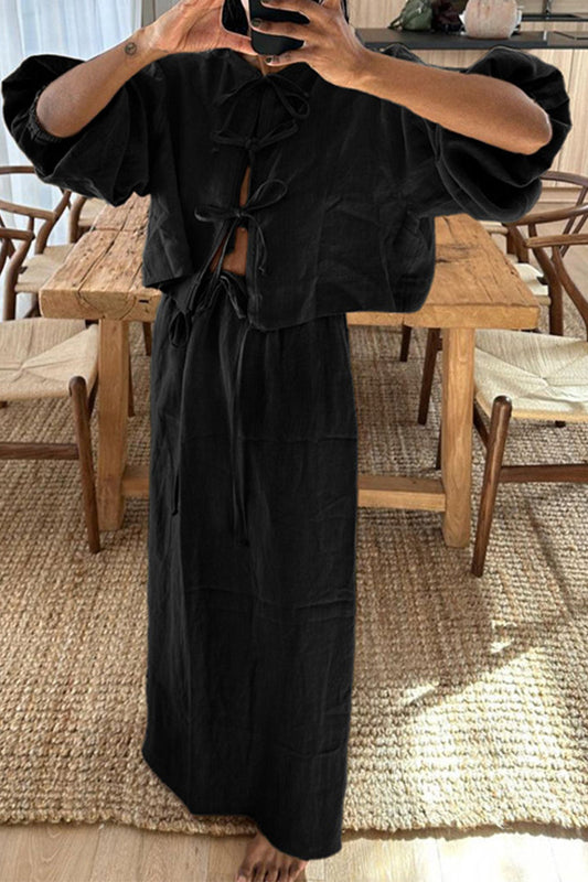 Casual Daily Solid Color Lace Up O Neck Long Sleeve Two Pieces