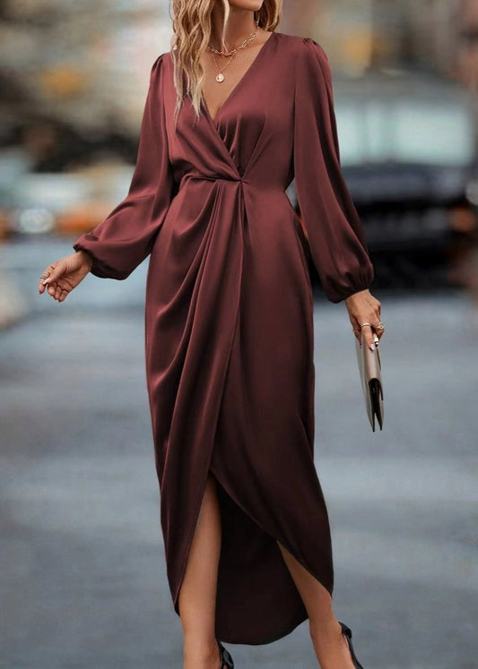 Elegant Wine Red Draped V-Neck Midi Dress