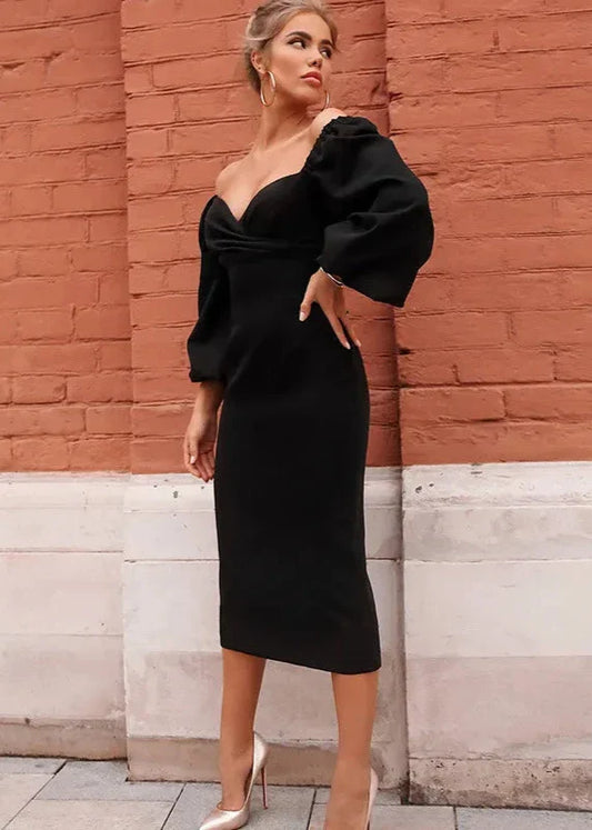 Puff Sleeve Elegant Midi Dress - Waist-Cinching Silhouette