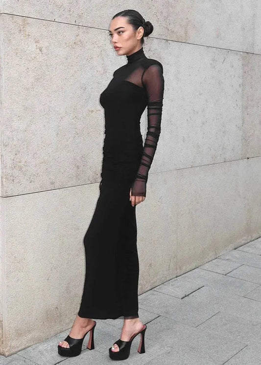 Mesh Stitching Finger Fit Design Long Sleeve Turtleneck Slim-fit Sheath Dress