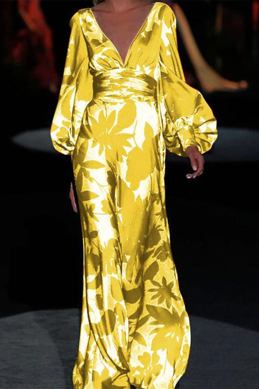 Sexy Flowers Patchwork Backless Flounce V Neck Long Dresses