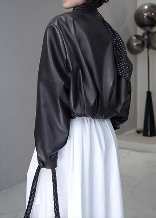 Urban Muse - Cropped Faux Leather Snap Jacket