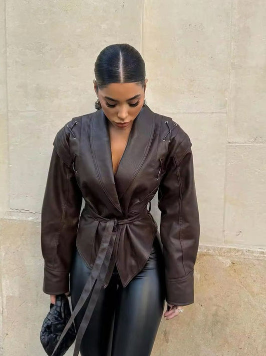 PU Leather Lace-up Lapel Collar Blazer Jacket