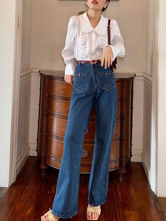 Casual Vintage Solid Patchwork High Waist Denim Jeans