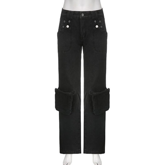 Solid irregular cargo pocket low rise zip-up jeans-final-sale