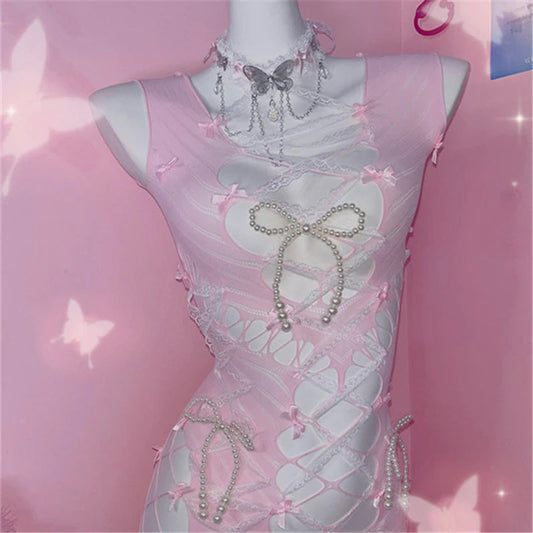 Pink Bow Hollow Jumpsuit Sexy Lingerie