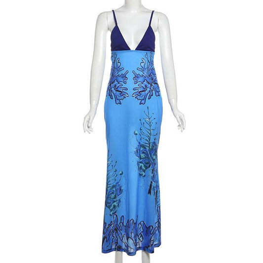 Sexy Printed Rhinestone Halter Backless Maxi Dress
