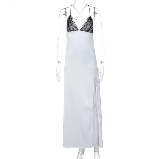 Lace slit v neck ruched backless cami maxi dress