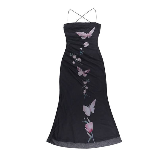 Mesh butterfly print cross back cami maxi dress