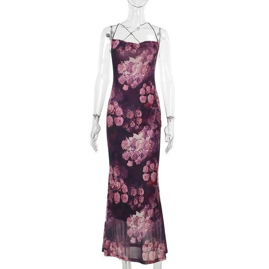 Irregular mesh halter flower pattern maxi dress