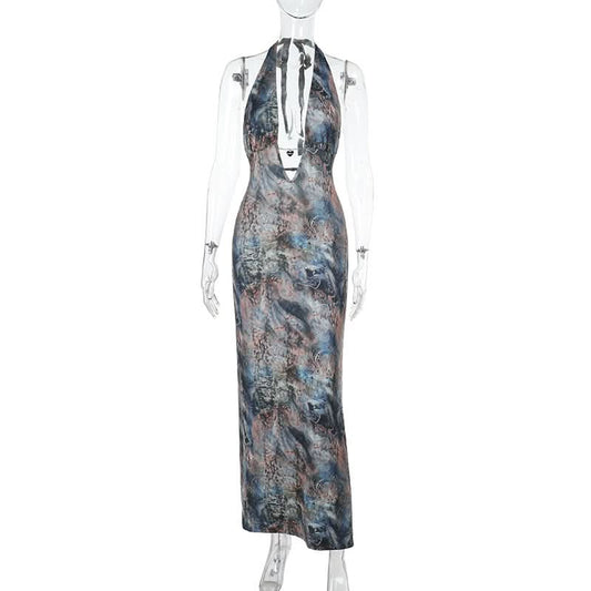 Halter hollow out ruched mesh ruffle backless cut out maxi dress