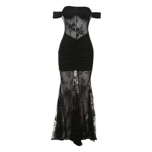 Off shoulder lace mesh zip-up maxi dress