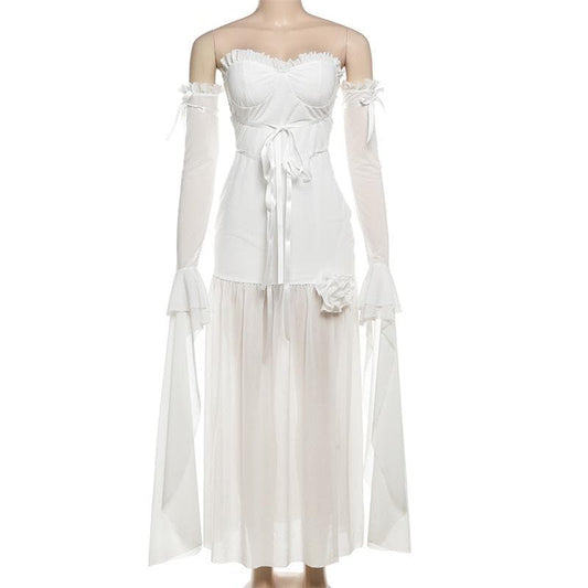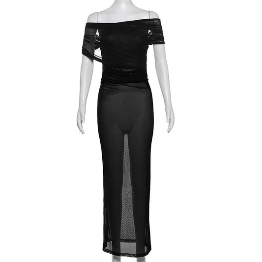 Off shoulder ruched cross front sheer mesh maxi dress-final-sale