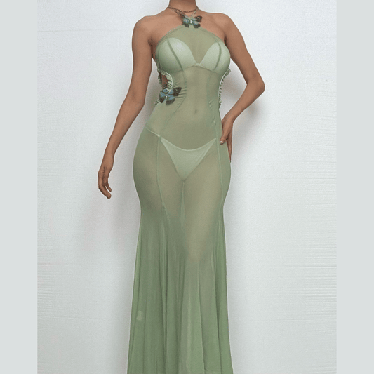 Halter sheer mesh butterfly applique backless maxi dress-final-sale