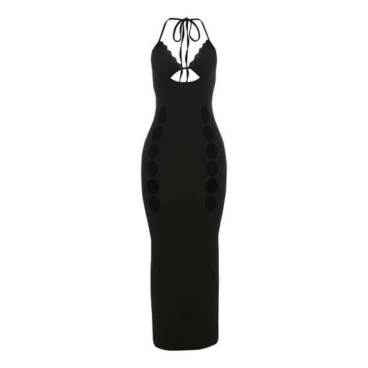 Self tie halter hollow out backless solid cut out maxi dress-final-sale