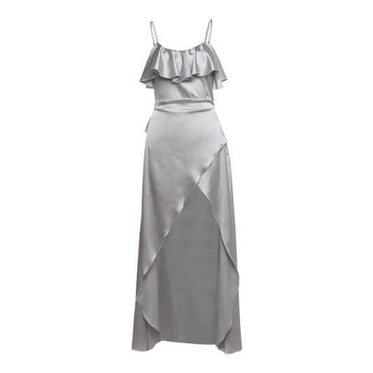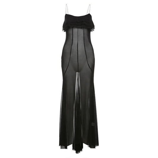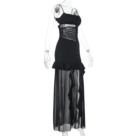Ruffle u neck mesh solid cami maxi dress