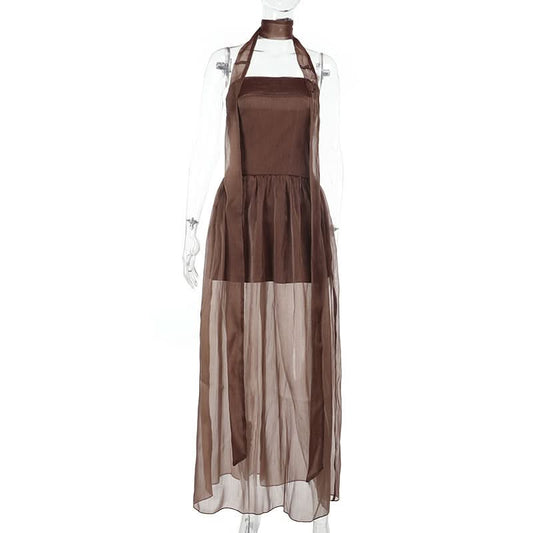 Halter self tie button mesh ruched maxi dress