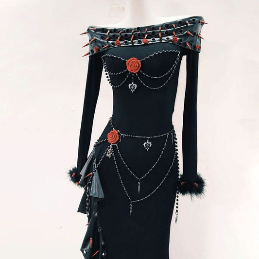Long sleeve off shoulder irregular flower applique maxi dress