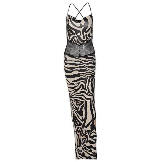 Zebra print hollow out contrast cross back slit backless cut out maxi dress-final-sale