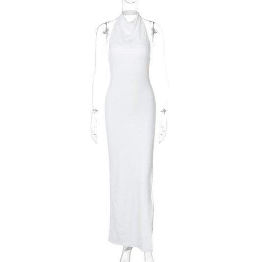 Slit halter sleeveless solid backless ruched maxi dress-final-sale