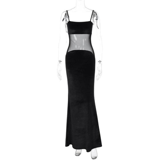 Self tie mesh patchwork backless velvet solid cami maxi dress-final-sale