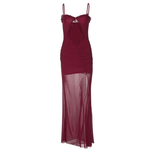 Hollow out mesh ruffle ruched cami cut out maxi dress-final-sale