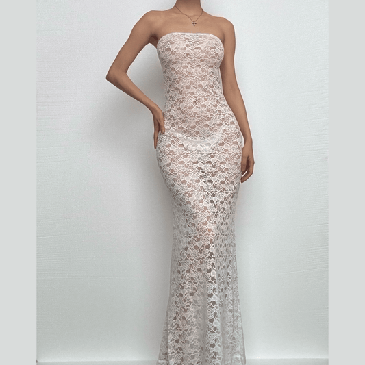 Long sleeve gloves high neck feather mesh see through maxi dress-final-sale