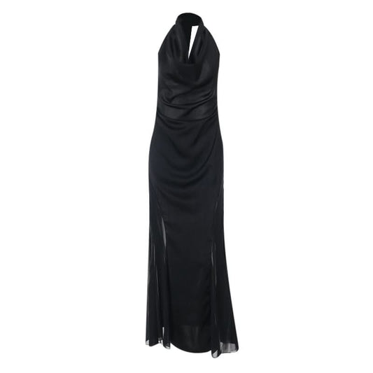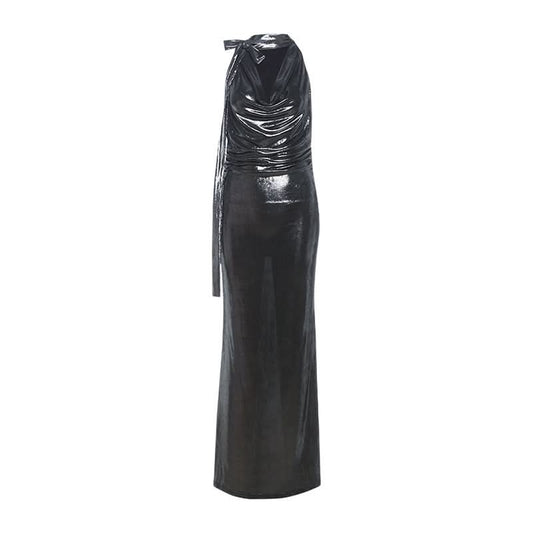 Ruched solid backless cowl neck cami maxi dress-final-sale