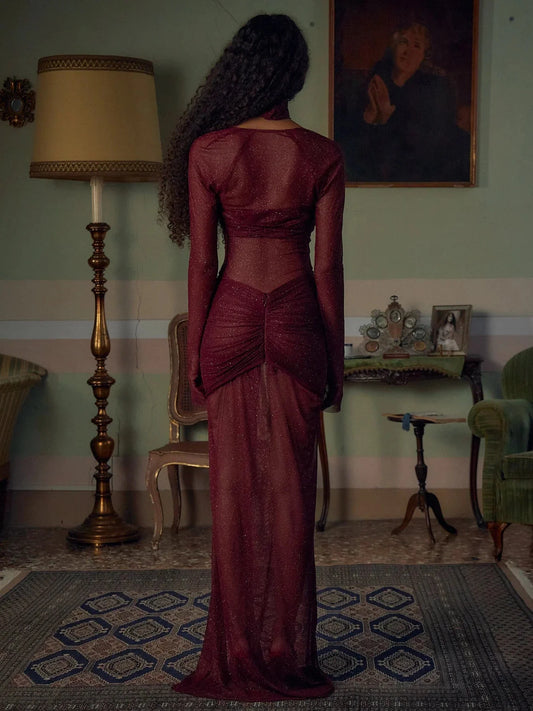 Shimmer Full Sleevees Backless High Slit Maxi Dress