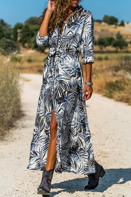 V-Neck Loose Peris Print Vacation Long Sleeve Maxi Dress