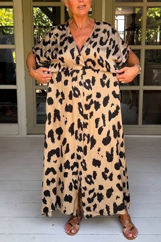 Leopard Round Neck Long Sleeve Split Maxi Dress