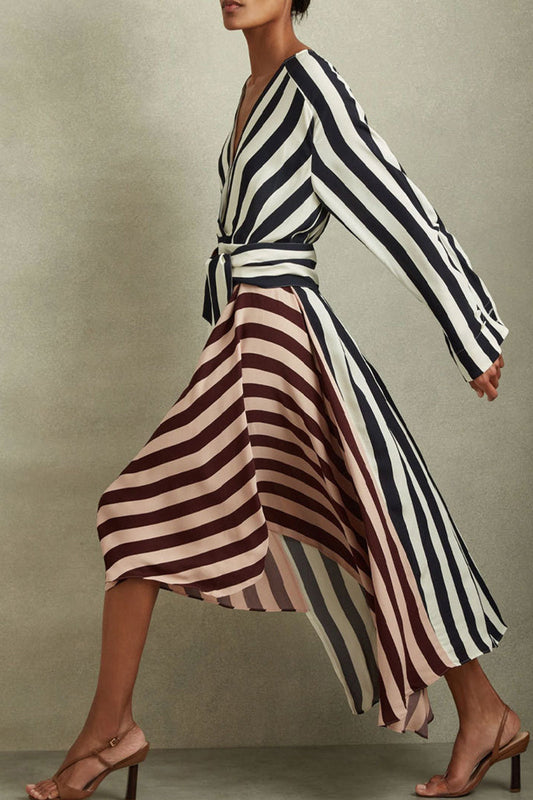 Elegant Striped Print Patchwork Contrast V Neck Sling Dresses